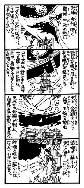 3コマ目:天上で割れた金の鏡が、下界では、鉤の形をした玉のような月になる…。ここのくだりが素敵です。旧暦の七夕では、月は必ず半月、上弦の月になるそうです。
