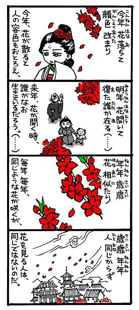 初唐の劉希夷(りゅうきい)(651−679?)の長い詩の中に出てくる、有名なフレーズを抜粋しました。