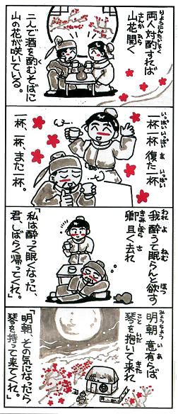 山の中で、隠者とお酒を酌み交わす。3、4コマ目の会話からしますと、お互い、気のおけない間柄のようす。