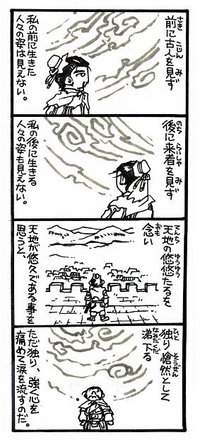 教科書で習った詩ですが…。天地は悠久なのに、自分は、昔の人にも、未来の人にも、会うことはできない…という想いは、今の時代も変わらないですね…。