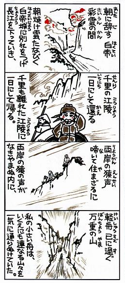「早に白帝城を発す(つとにはくていじょうをはっす)」。朝早くに、白帝城を出発。スピード感ある一作。